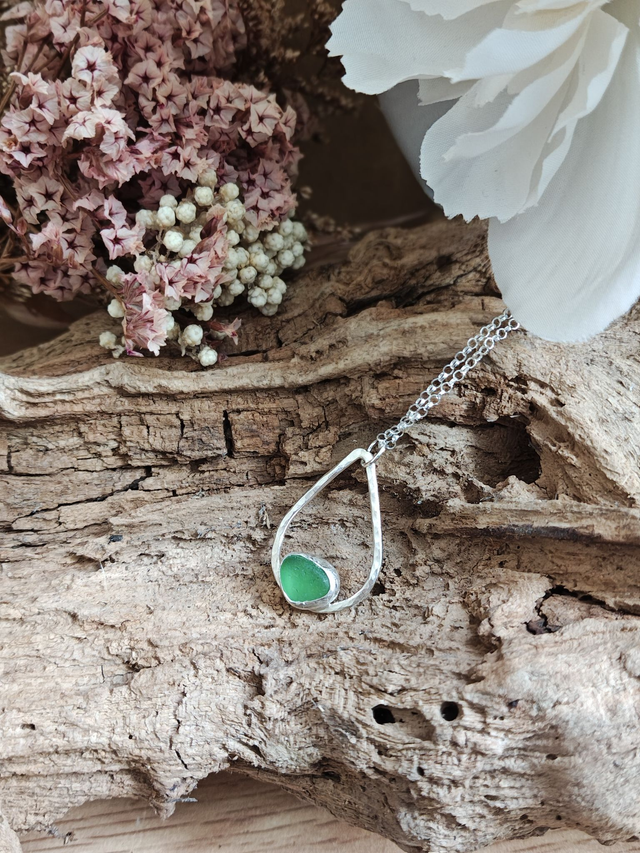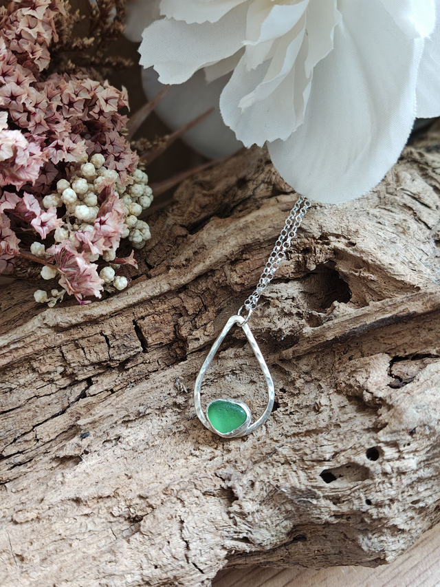 Set in a hammered sterling silver teardrop, this pendant holds a piece of emerald green seaglass — shaped by the sea, softened by the waves, and transformed into jewellery. A symbol of renewal and nature’s artistry, each piece is as unique as the shoreline it came from