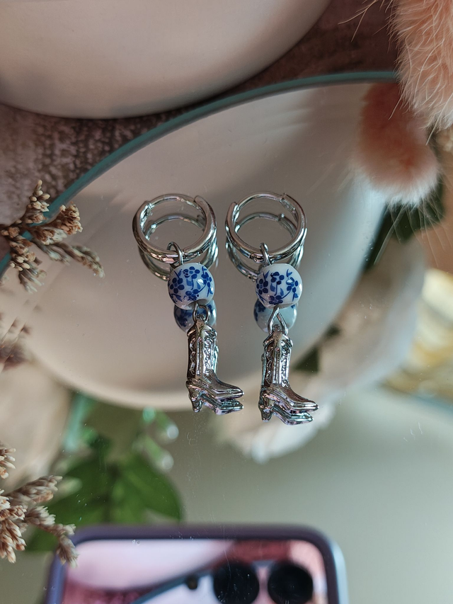 Stainless steel huggie hoops with a blue floral ceramic bead and stainless steel cowboy boots
